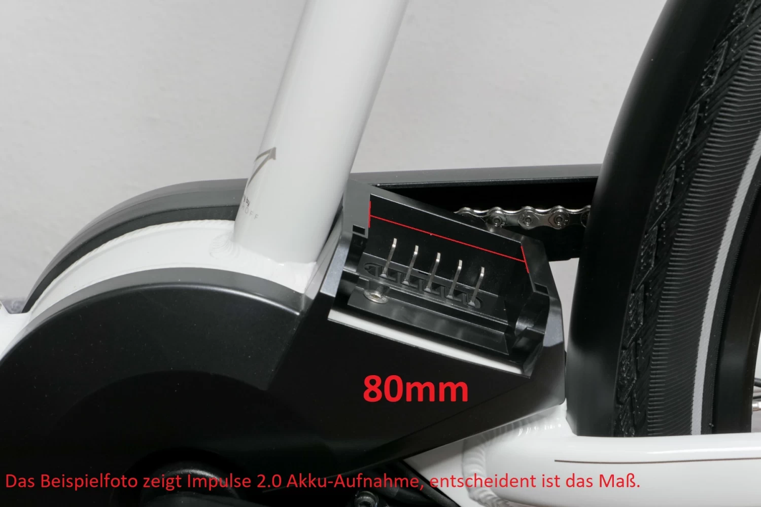 Bitte vergleichen Sie noch einmal die Akkufußbreite bzw. den Schacht der Akkuaufnahme am eBike wenn Sie seitlich davor stehen. Der Impulse EVO Next Akku-Einbauschacht hat eine Breite von 80mm. Gemessen wird ohne die seitlichen Führungsnuten.